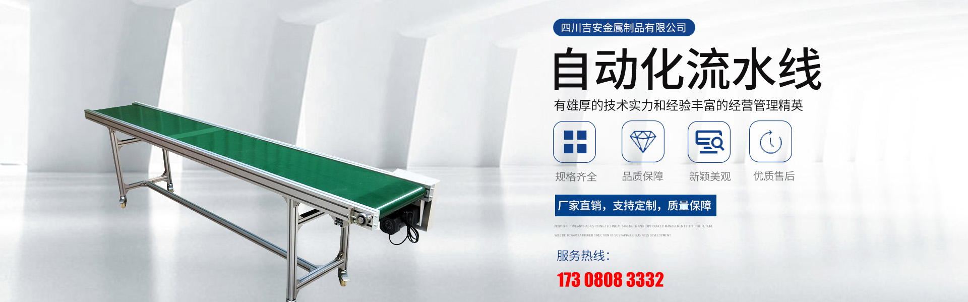 四川吉安金屬制品有限公司是集工業(yè)鋁型材及配件、貨架、工作臺(tái)、皮帶輸送線、自動(dòng)化流水線、線棒精益管及扣件、鈑金和鋁合金流利條、鋁線棒及扣件、倉儲(chǔ)設(shè)備、物流器具、周轉(zhuǎn)臺(tái)車、工位器具、非標(biāo)器具設(shè)...
